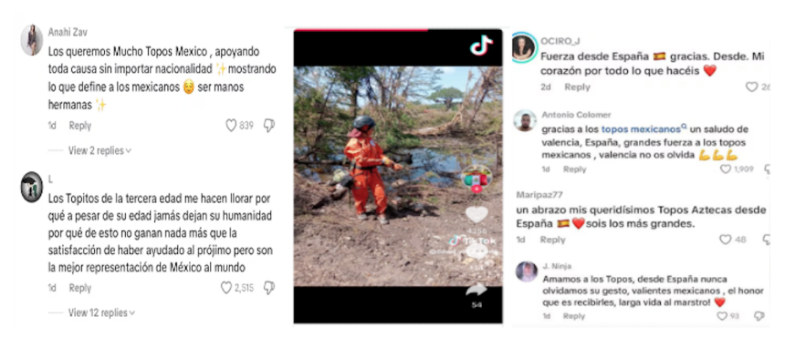 Un sinfín de comentarios emotivos ha llenado las publicaciones y los videos de los topos mexicanos, donde los usuarios han dejado sus mensajes sobre el orgullo que da que los topos mexicanos atiendan a cualquier país donde haya ocurrido un desastre, y sobre la convicción que tienen estos voluntarios por servir a la sociedad y ayudar a los damnificados.